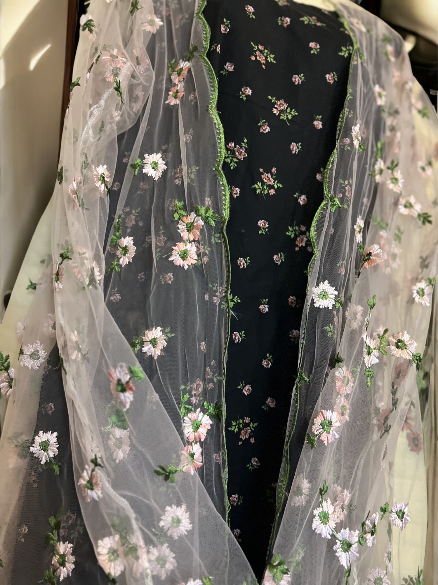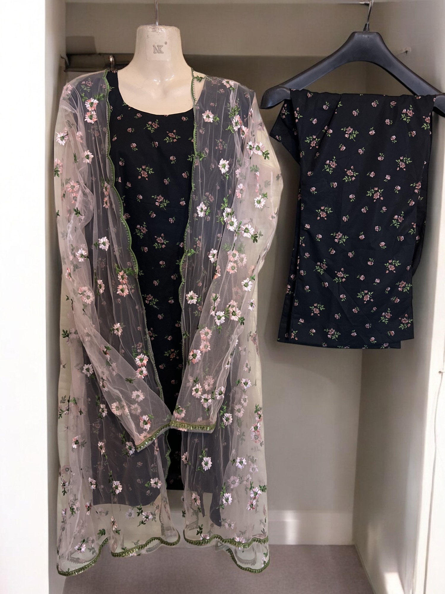A graceful ensemble with a stylish net gown, perfect for any occasion